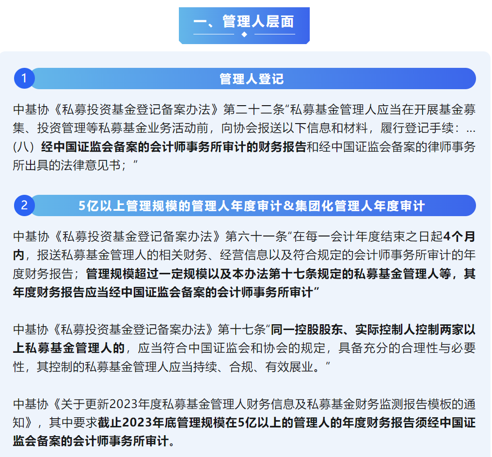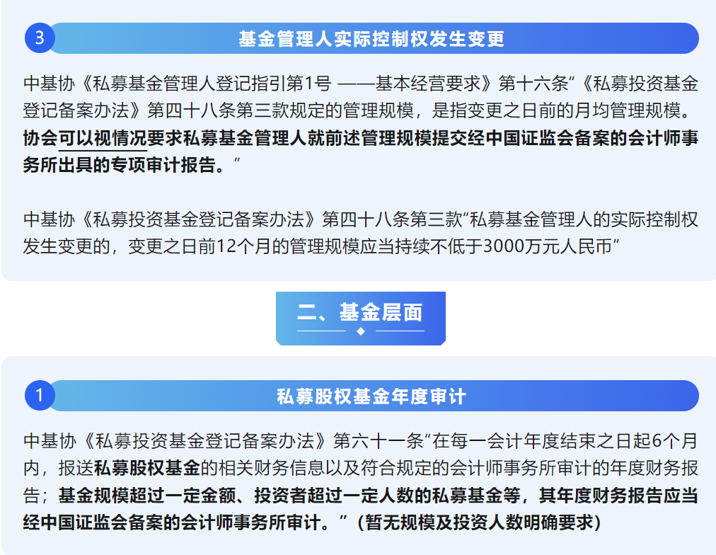 私募基金管理(lǐ)人(rén)登記、5億以上管理(lǐ)規模的管理(lǐ)人(rén)年(nián)度審計、集團化管理(lǐ)人(rén)年(nián)度審計、管理(lǐ)人(rén)實控權變更、私募股權基金年(nián)度審計均需要經中國(guó)證監會備案的會計師事務所審計。